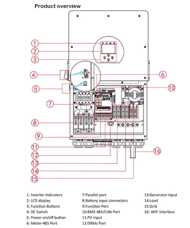 รูปภาพนี้แสดงแผนผังภาพรวมและตำแหน่งของส่วนประกอบหลักบนตัวเครื่องของ ไฮบริดอินเวอร์เตอร์ โดยมีการระบุหมายเลขตั้งแต่ 1 ถึง 16 พร้อมคำอธิบาย ซึ่งช่วยให้เข้าใจถึงจุดเชื่อมต่อและการควบคุมต่างๆ ของเครื่อง: