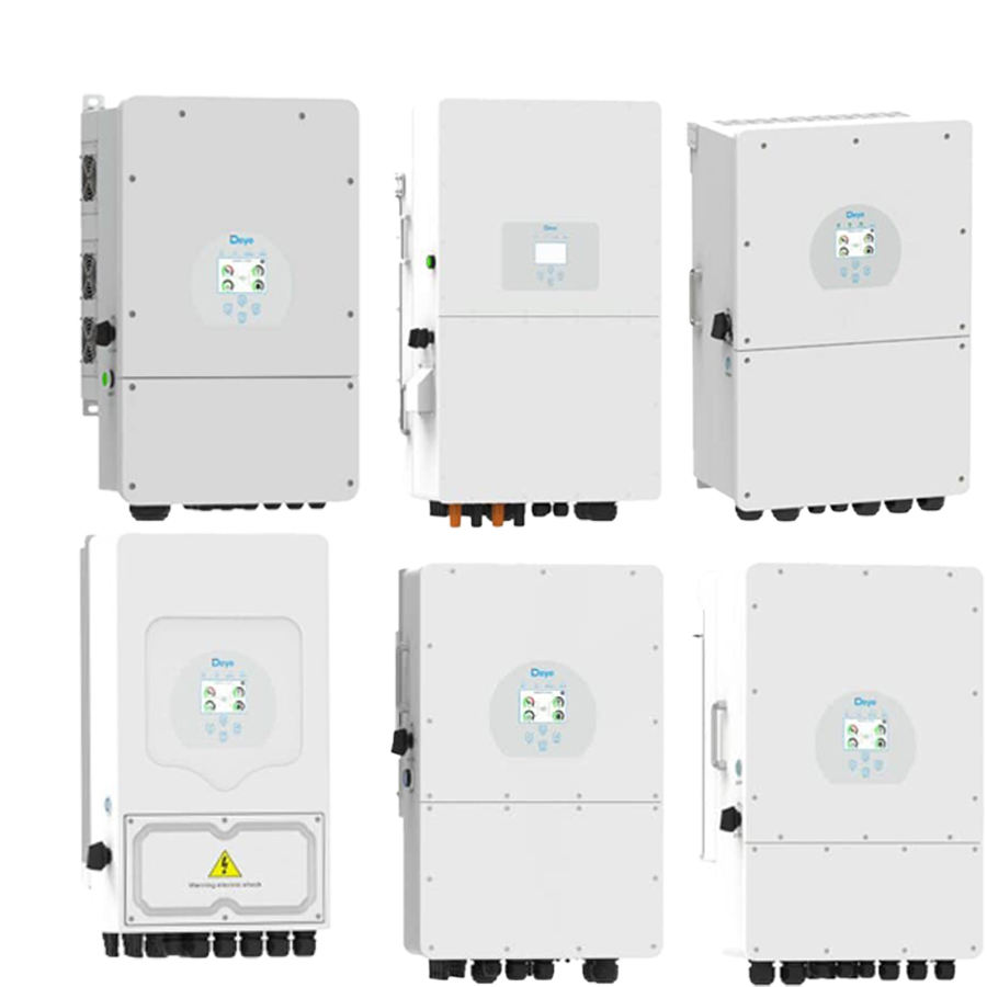 รูปภาพนี้แสดงคอลเลกชันของ ไฮบริดอินเวอร์เตอร์ (Hybrid Inverter) แบรนด์ Deye ในมุมมองที่หลากหลาย เพื่อแสดงให้เห็นถึงความหลากหลายของรุ่นที่มาพร้อมกับดีไซน์ที่เป็นมาตรฐานเดียวกัน เน้นความทันสมัย และความแข็งแรงทนทานสำหรับการติดตั้งภายนอกอาคาร