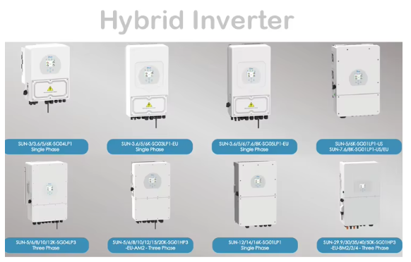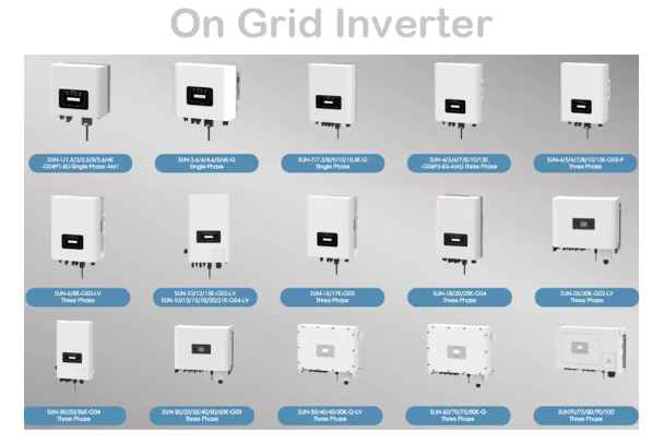 แถวล่าง ซ้ายและขวา: เป็นรุ่นที่ใช้กับระบบไฟฟ้าสามเฟส (Three Phase) ซึ่งจำเป็นสำหรับธุรกิจหรือบ้านที่มีการใช้ไฟฟ้าในปริมาณสูง โดยมีกำลังผลิตตั้งแต่ 5KW ไปจนถึง 50KW: