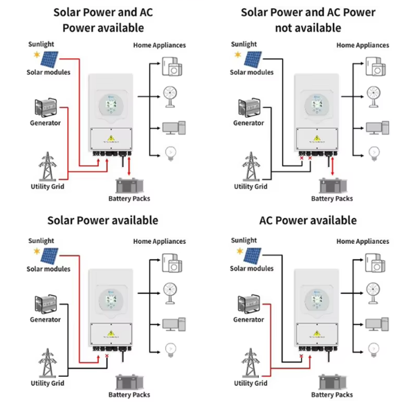 รูปภาพนี้แสดงการทำงานของ ไฮบริดอินเวอร์เตอร์ ใน 4 สถานการณ์หลัก โดยเน้นการจัดการลำดับความสำคัญของแหล่งพลังงาน (Solar, Grid, Generator, Battery) เพื่อจ่ายไฟให้กับ Home Appliances (เครื่องใช้ไฟฟ้าภายในบ้าน) โดยเส้นสีแดงแสดงถึงทิศทางการไหลของพลังงาน ณ ขณะนั้น