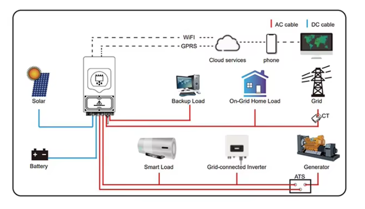 รูปภาพนี้แสดงผังไดอะแกรมของระบบพลังงานไฮบริดที่ซับซ้อนและมีประสิทธิภาพสูง โดยมี อินเวอร์เตอร์ไฮบริด (กล่องสี่เหลี่ยมตรงกลาง) ทำหน้าที่เป็นผู้จัดการพลังงานหลักที่สามารถผสานการทำงานของแหล่งกำเนิดพลังงานที่หลากหลายเข้ากับระบบการจ่ายโหลดที่แยกประเภทอย่างชัดเจน พร้อมการควบคุมผ่านระบบสื่อสารอัจฉริยะ