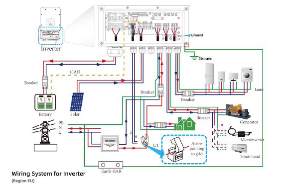 มีการเชื่อมต่อสายสื่อสาร CAN (เส้นประสีเหลือง) เพื่อให้ Inverter และ Battery (BMS) สามารถสื่อสารและจัดการการชาร์จ/จ่ายไฟได้อย่างเหมาะสม