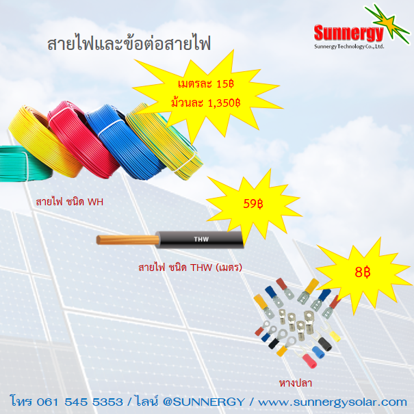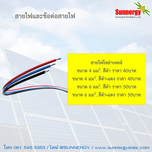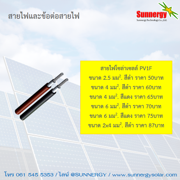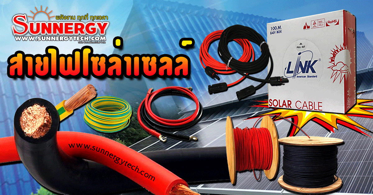 สายไฟโซล่าเซลล์เป็นอุปกรณ์ในระบบโซล่าเซลล์ที่มองข้ามไม่ได้อีกอย่างหนึ่ง เป็นอุปกรณ์นำส่งพลังงานหรือส่งกำลังไฟฟ้าเข้าสู่ระบบโซล่าเซลล์ ส่งกำลังเข้าสู่สายส่ง เพราะเมื่อแผงโซล่าเซลล์ ผลิตกระแสไฟฟ้าเสร็จแล้วจะมีการนำพลังงานหรือกระไฟฟ้าที่ผลิตส่งผ่านไปยังอุปกรณ์ต่างๆในระบบโซล่าเซลล์ จึงเปรียบเสมือนท่อน้ำหรือท่อส่งน้ำ จึงเจำป็นต้องมีคุณลักษณะสายไฟที่เหมาะสมโดยเฉพาะ ซันเนอร์ยี่จึงได้มองเห็นความสำคัญดังกล่าวจึงได้คัดสรรค์ สายไฟฟ้าโซล่าเซลล์ หรือ ที่เรียกว่า PV-1F ซึ่งเป็นสายไฟที่ผลิตขึ้นมาสำหรับระบบโซล่าเซลล์โดยเฉพาะ เพื่อความมีเสถียรภาพของระบบโซล่าเซลล์ ที่ต้องการความรวดเร็วในการส่งกำลังไฟฟ้าอย่างต่อเนื่อง เพราะสายไฟโซล่าเซลล์ PF-1F จะต้องมีการส่งแรงดันไฟฟ้าและกระแสไฟฟ้าไปยังอุปกรณ์โซล่าเซลล์ต่างๆในระบบโซล่าเซลล์ ด้วยเหตุผลเพราะว่าระบบโซล่าเซลล์เมื่อติดตั้งไปแล้วจะต้องใช้งานเป็นระยะเวลานานหลายปี เราจึงไม่สามารถเลือกสายไฟโซล่าเซลล์ ที่ไม่ทนต่อสภาพอาการ ทนแดด ทนฝน ทนความร้อน มาใช้งานในระบบโซล่าเซลล์ได้